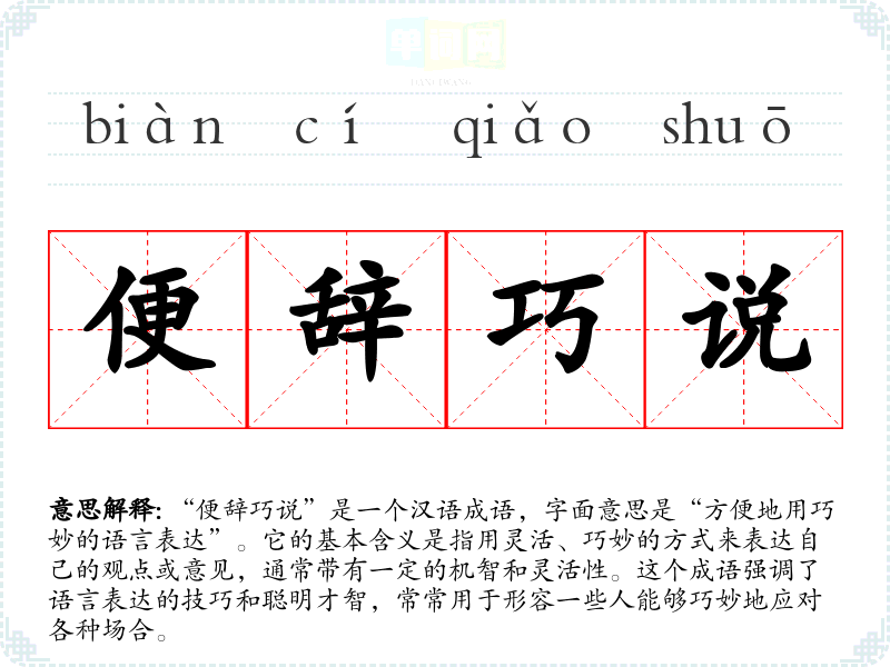 “便辞巧说”并没有明确的历史典故或文学出处,但其构成的字词都在古代汉语中有广泛的使用。成语中的“便辞”可以理解为“方便的言辞”,而“巧说”则指“巧妙的言语”。这两个词的结合,反映出一种语言表达的灵活性和巧妙性,适合在各种情况下使用。