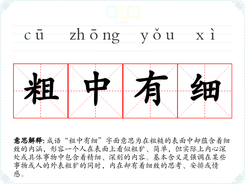 成语“粗中有细”字面意思为在粗糙的表面中却蕴含着细致的内涵,形容一个人在表面上看似粗犷、简单,但实际上内心深处或具体事物中包含着精细、深刻的内容。基本含义是强调在某些事物或人的外表粗犷的同时,内在却有着细致的思考、安排或情感。
