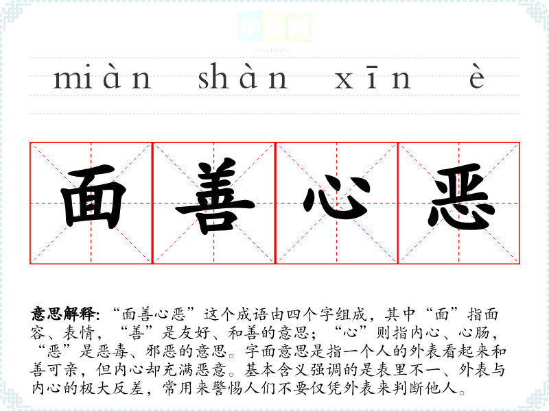 “面善心恶”这个成语由四个字组成,其中“面”指面容、表情,“善”是友好、和善的意思;“心”则指内心、心肠,“恶”是恶毒、邪恶的意思。字面意思是指一个人的外表看起来和善可亲,但内心却充满恶意。基本含义强调的是表里不一、外表与内心的极大反差,常用来警惕人们不要仅凭外表来判断他人。