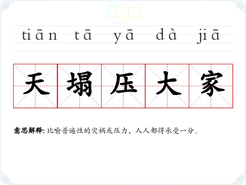 | 天塌压大家 | 比喻普遍性的灾祸或压力,人人都得承受一分。 |