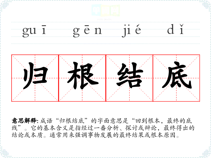 成语“归根结底”的字面意思是“回到根本,最终的底线”。它的基本含义是指经过一番分析、探讨或辩论,最终得出的结论或本质。通常用来强调事物发展的最终结果或根本原因。
