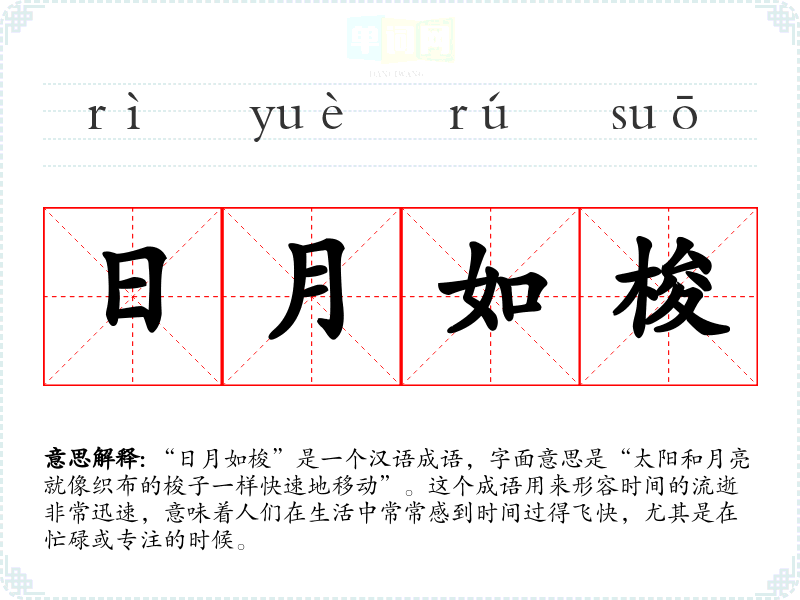 “日月如梭”是一个汉语成语,字面意思是“太阳和月亮就像织布的梭子一样快速地移动”。这个成语用来形容时间的流逝非常迅速,意味着人们在生活中常常感到时间过得飞快,尤其是在忙碌或专注的时候。