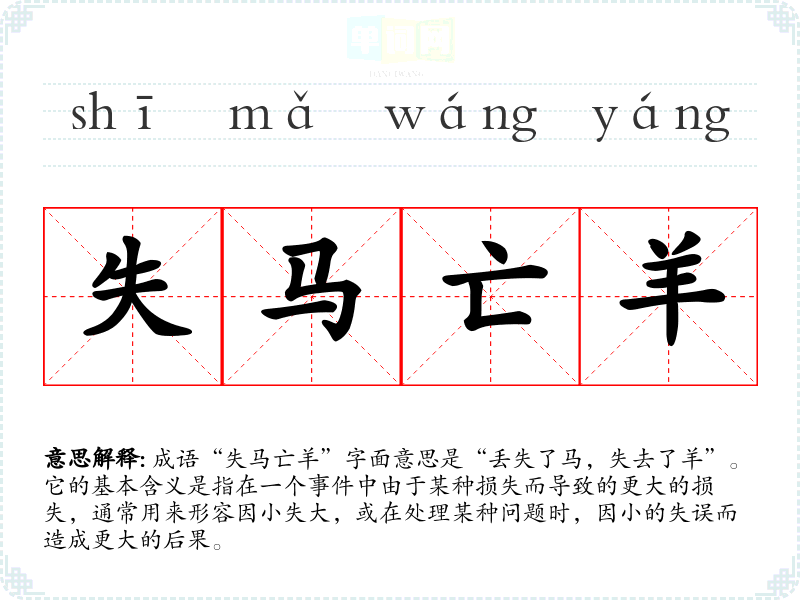 成语“失马亡羊”字面意思是“丢失了马,失去了羊”。它的基本含义是指在一个**中由于某种损失而导致的更大的损失,通常用来形容因小失大,或在处理某种问题时,因小的失误而造成更大的后果。