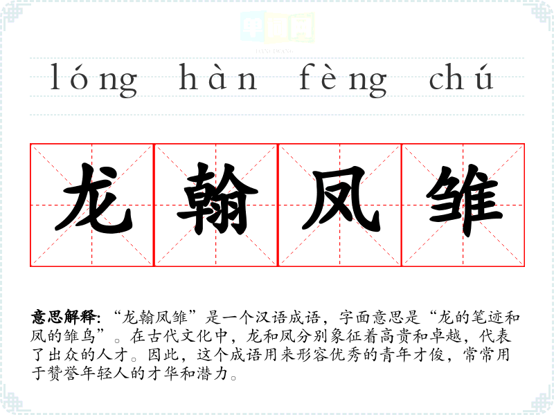 “龙翰凤雏”是一个汉语成语,字面意思是“龙的笔迹和凤的雏鸟”。在古代文化中,龙和凤分别象征着高贵和卓越,代表了出众的人才。因此,这个成语用来形容优秀的青年才俊,常常用于赞誉年轻人的才华和潜力。