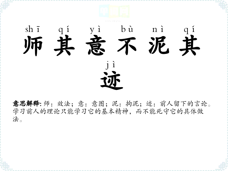 | 师其意不泥其迹 | 师:效法;意:意图;泥:拘泥;迹:前人留下的言论。学习前人的理论只能学习它的基本精神,而不能死守它的具体做法。 |