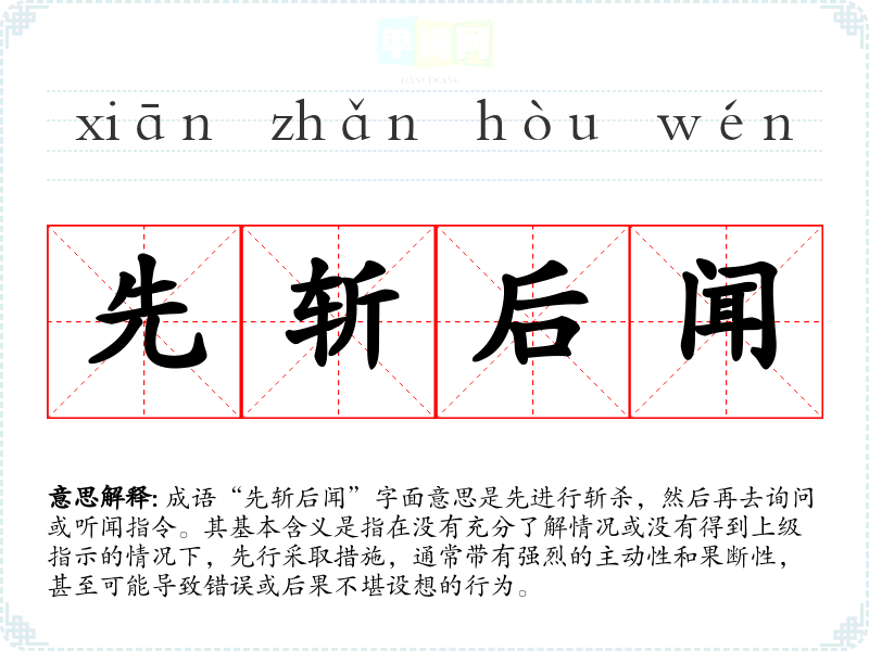成语“先斩后闻”字面意思是先进行斩杀,然后再去询问或听闻指令。其基本含义是指在没有充分了解情况或没有得到上级指示的情况下,先行采取措施,通常带有强烈的主动性和果断性,甚至可能导致错误或后果不堪设想的行为。