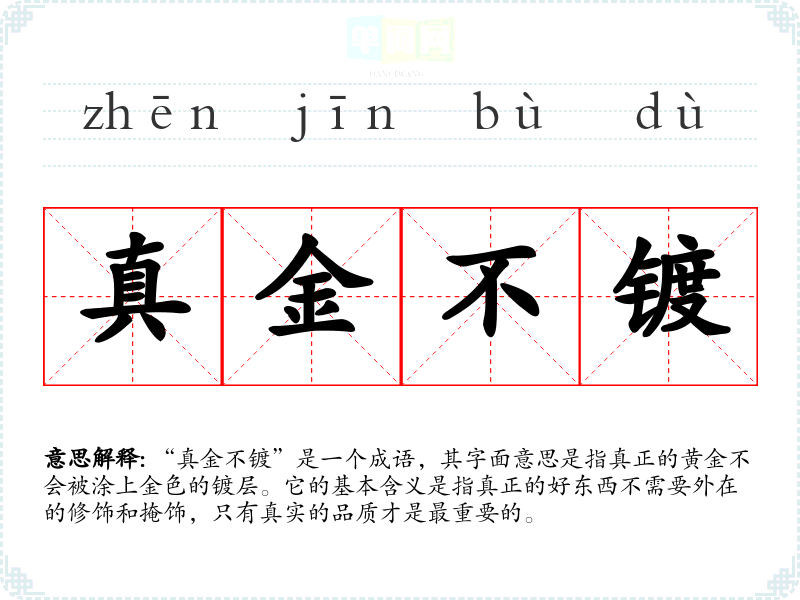 “真金不镀”是一个成语,其字面意思是指真正的黄金不会被涂上金色的镀层。它的基本含义是指真正的好东西不需要外在的修饰和掩饰,只有真实的品质才是最重要的。