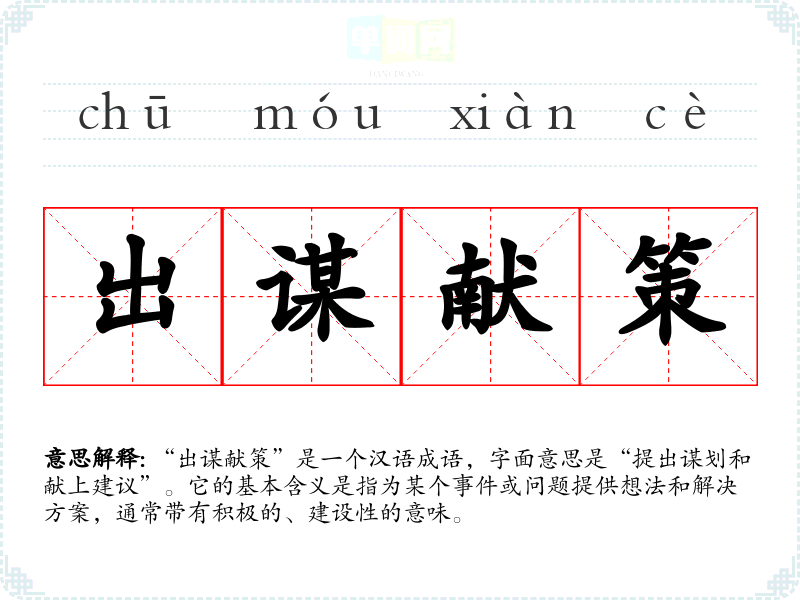 | 出谋献策 | 出主意、想对策来帮助解决问题。 |