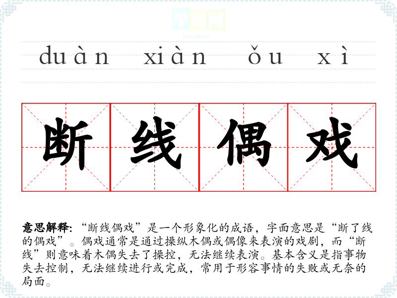 “断线偶戏”是一个形象化的成语,字面意思是“断了线的偶戏”。偶戏通常是通过操纵木偶或偶像来表演的戏剧,而“断线”则意味着木偶失去了操控,无法继续表演。基本含义是指事物失去控制,无法继续进行或完成,常用于形容事情的失败或无奈的局面。