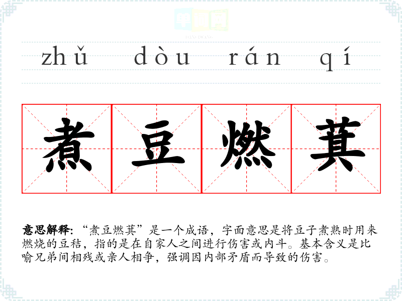 “煮豆燃萁”是一个成语,字面意思是将豆子煮熟时用来燃烧的豆秸,指的是在自家人之间进行伤害或内斗。基本含义是比喻兄弟间相残或亲人相争,强调因内部矛盾而导致的伤害。