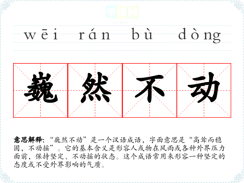 “巍然不动”是一个汉语成语,字面意思是“高耸而稳固,不动摇”。它的基本含义是形容人或物在风雨或各种外界压力面前,保持坚定、不动摇的状态。这个成语常用来形容一种坚定的态度或不受外界影响的气质。