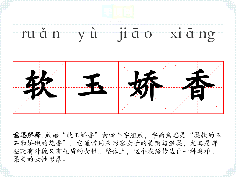 成语“软玉娇香”由四个字组成,字面意思是“柔软的玉石和娇嫩的花香”。它通常用来形容女子的美丽与温柔,尤其是那些既有外貌又有气质的女性。整体上,这个成语传达出一种典雅、柔美的女性形象。