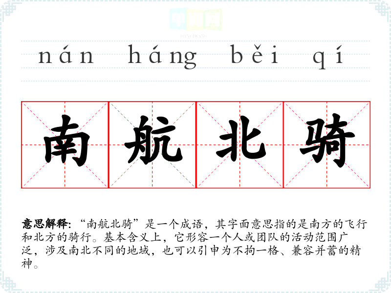 “南航北骑”是一个成语,其字面意思指的是南方的飞行和北方的骑行。基本含义上,它形容一个人或团队的活动范围广泛,涉及南北不同的地域,也可以引申为不拘一格、兼容并蓄的精神。