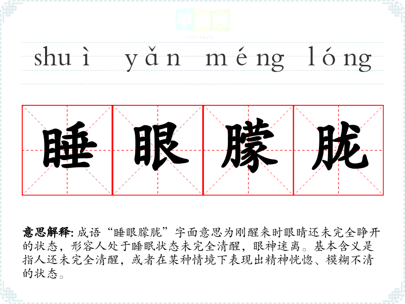 | 睡眼朦胧 | 朦胧:模糊不清。形容双眼模糊不清的样子。 |