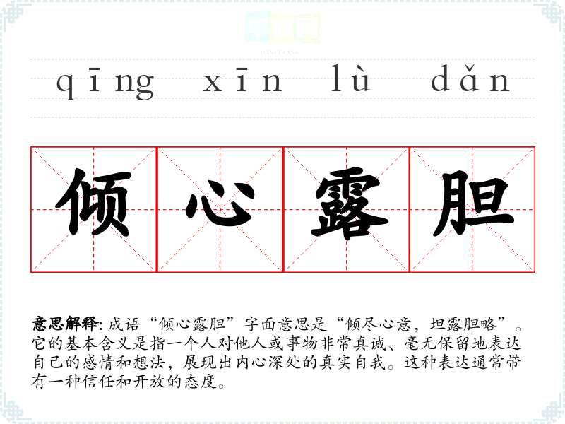 成语“倾心露胆”字面意思是“倾尽心意,坦露胆略”。它的基本含义是指一个人对他人或事物非常真诚、毫无保留地表达自己的感情和想法,展现出内心深处的真实自我。这种表达通常带有一种信任和开放的态度。
