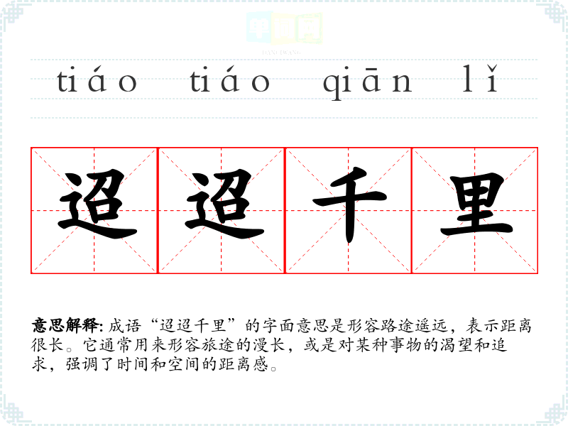 成语“迢迢千里”的字面意思是形容路途遥远,表示距离很长。它通常用来形容旅途的漫长,或是对某种事物的渴望和追求,强调了时间和空间的距离感。