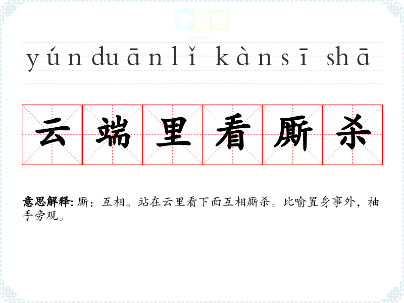 | 云端看厮杀 | 厮:互相。站在云里看下面互相厮杀。比喻置身事外,袖手旁观。 |
