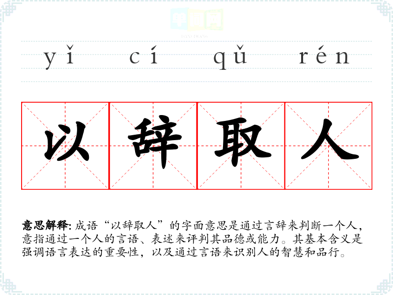 成语“以辞取人”的字面意思是通过言辞来判断一个人,意指通过一个人的言语、表述来评判其品德或能力。其基本含义是强调语言表达的重要性,以及通过言语来识别人的智慧和品行。
