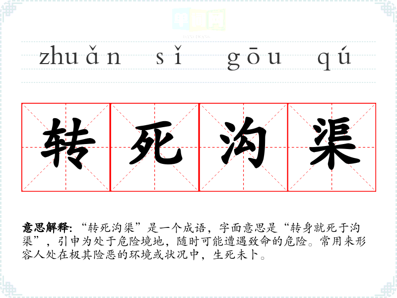“转死沟渠”是一个成语,字面意思是“转身就死于沟渠”,引申为处于危险境地,随时可能遭遇致命的危险。常用来形容人处在极其险恶的环境或状况中,生死未卜。