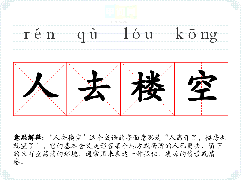 “人去楼空”这个成语的字面意思是“人离开了,楼房也就空了”。它的基本含义是形容某个地方或场所的人已离去,留下的只有空荡荡的环境,通常用来表达一种孤独、凄凉的情景或情感。
