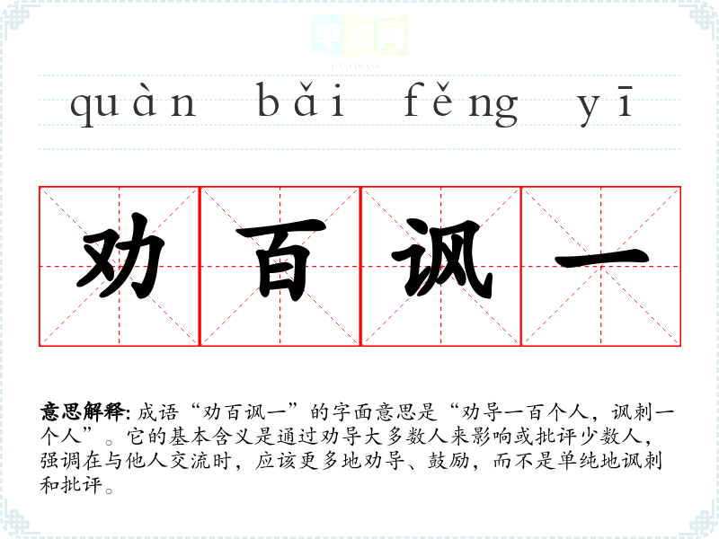 成语“劝百讽一”的字面意思是“劝导一百个人,讽刺一个人”。它的基本含义是通过劝导大多数人来影响或批评少数人,强调在与他人交流时,应该更多地劝导、鼓励,而不是单纯地讽刺和批评。
