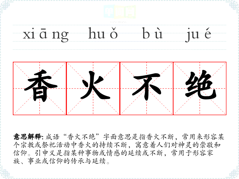 “香火不绝”源于传统文化,尤其与道教和的祭祀活动密切相关。历史上,香火是祭祀神灵的方式,代表着人们对祖先、神明的尊敬和纪念。当香火不断时,意味着祭祀活动的频繁,或是对某个地方、某位神灵的崇拜持续不断。因此,这个成语反映了传统文化中对祖先崇拜和信仰的重视。