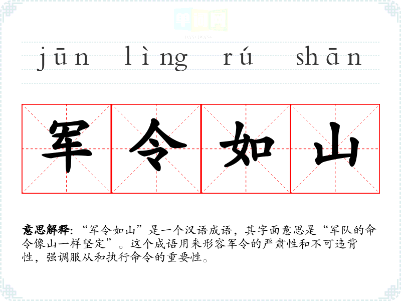 “军令如山”是一个汉语成语,其字面意思是“军队的命令像山一样坚定”。这个成语用来形容军令的严肃性和不可违背性,强调服从和执行命令的重要性。