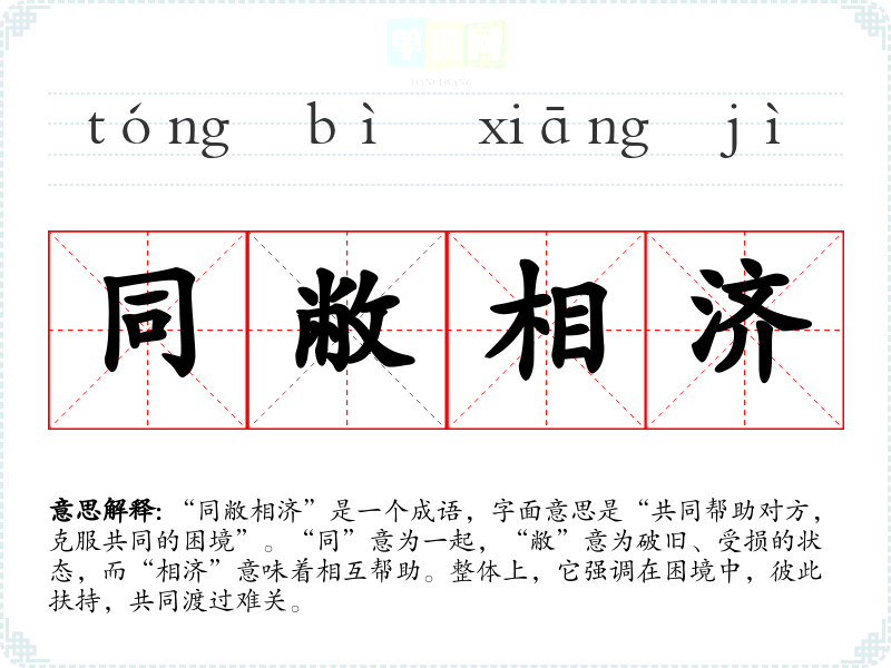“同敝相济”是一个成语,字面意思是“共同帮助对方,克服共同的困境”。“同”意为一起,“敝”意为破旧、受损的状态,而“相济”意味着相互帮助。整体上,它强调在困境中,彼此扶持,共同渡过难关。