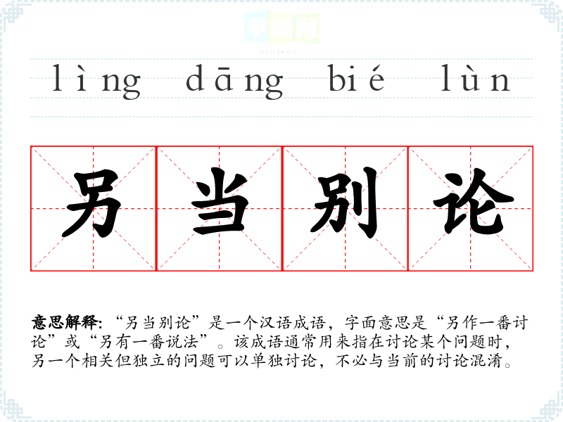 “另当别论”是一个汉语成语,字面意思是“另作一番讨论”或“另有一番说法”。该成语通常用来指在讨论某个问题时,另一个相关但独立的问题可以单独讨论,不必与当前的讨论混淆。