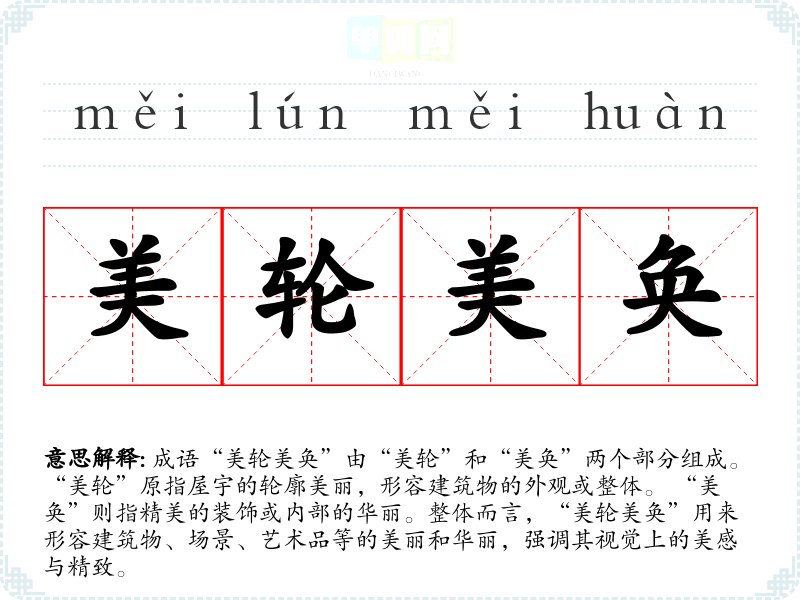 成语“美轮美奂”由“美轮”和“美奂”两个部分组成。“美轮”原指屋宇的轮廓美丽,形容建筑物的外观或整体。 “美奂”则指精美的装饰或内部的华丽。整体而言,“美轮美奂”用来形容建筑物、场景、艺术品等的美丽和华丽,强调其视觉上的美感与精致。