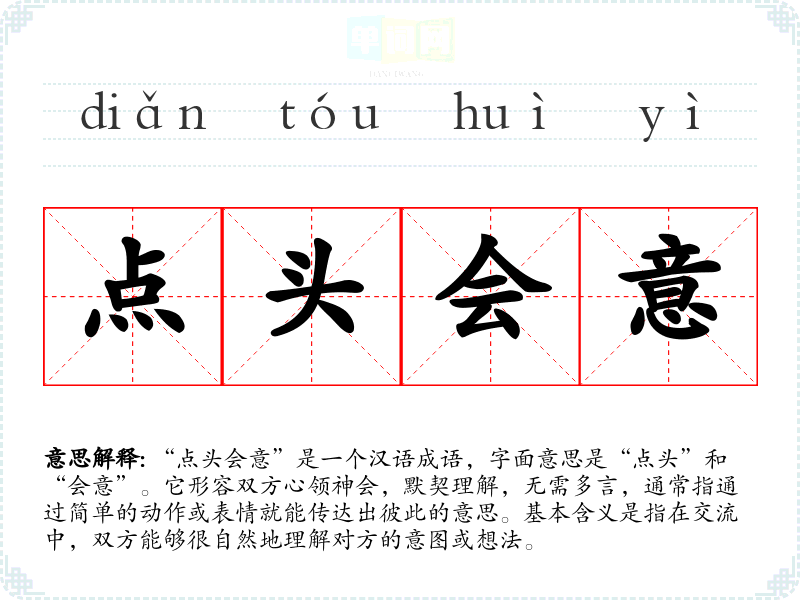 “点头会意”是一个汉语成语,字面意思是“点头”和“会意”。它形容双方心领神会,默契理解,无需多言,通常指通过简单的动作或表情就能传达出彼此的意思。基本含义是指在交流中,双方能够很自然地理解对方的意图或想法。