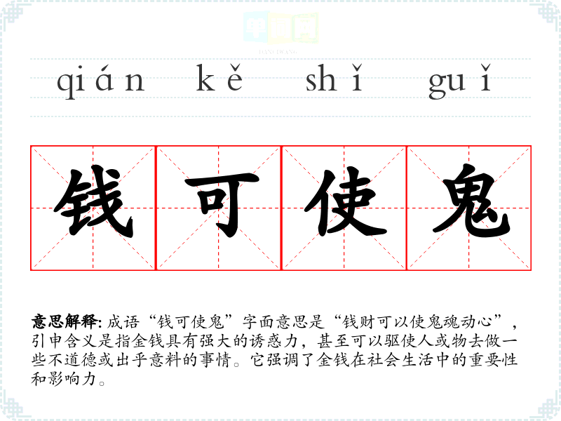 成语“钱可使鬼”字面意思是“钱财可以使鬼魂动心”,引申含义是指金钱具有强大的诱惑力,甚至可以驱使人或物去做一些不道德或出乎意料的事情。它强调了金钱在社会生活中的重要性和影响力。