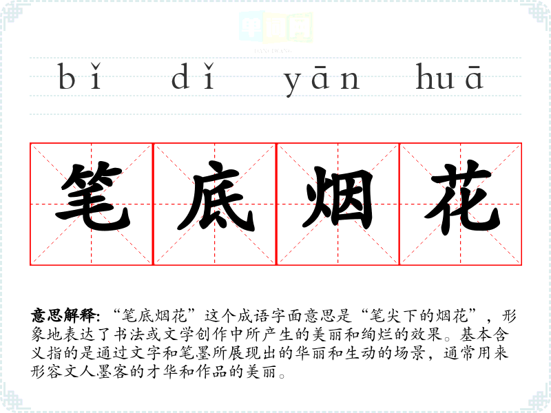 “笔底烟花”这个成语字面意思是“笔尖下的烟花”,形象地表达了书法或文学创作中所产生的美丽和绚烂的效果。基本含义指的是通过文字和笔墨所展现出的华丽和生动的场景,通常用来形容文人墨客的才华和作品的美丽。