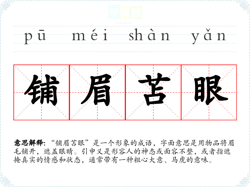 “铺眉苫眼”是一个形象的成语,字面意思是用物品将眉毛铺开,遮盖眼睛。引申义是形容人的神态或面容不整,或者指遮掩真实的情感和状态,通常带有一种粗心大意、马虎的意味。