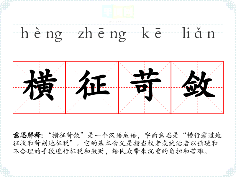 “横征苛敛”是一个汉语成语,字面意思是“横行霸道地征收和苛刻地征税”。它的基本含义是指当权者或统治者以强硬和不合理的手段进行征税和敛财,给民众带来沉重的负担和苦难。