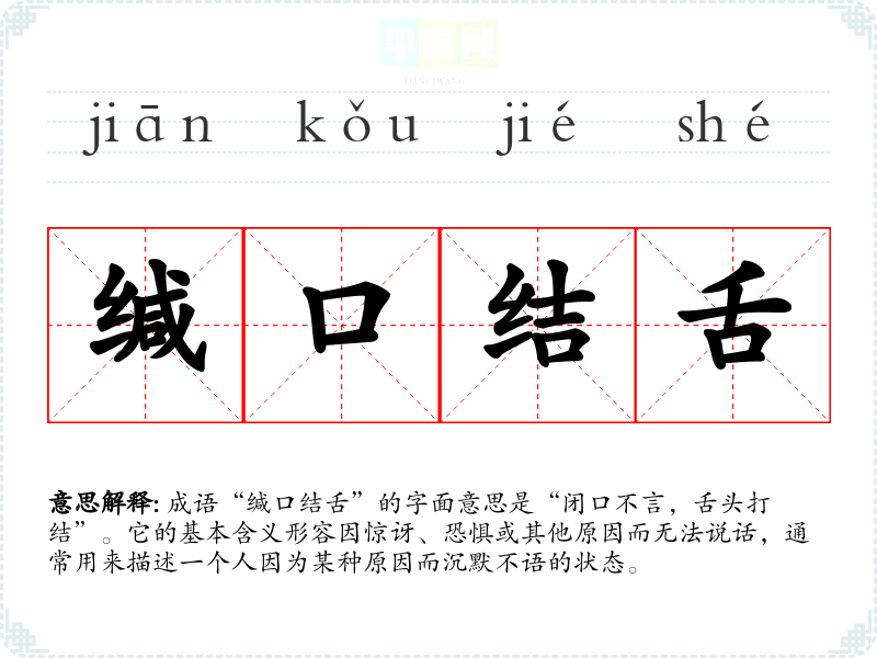 成语“缄口结舌”的字面意思是“闭口不言,舌头打结”。它的基本含义形容因惊讶、恐惧或其他原因而无法说话,通常用来描述一个人因为某种原因而沉默不语的状态。