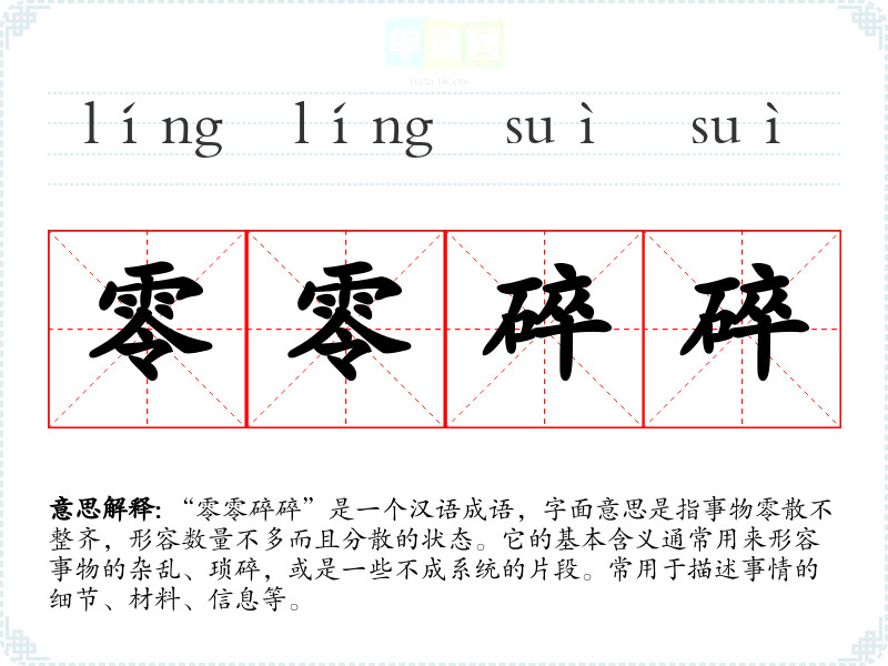 “零零碎碎”并没有明确的历史背景或典故,它的使用可以追溯到古代汉语中“零”和“碎”两个字的组合。“零”有分散、不完整的意思,而“碎”则指破裂、分散的状态。这个成语的形成反映了汉语的特点,即通过叠词增强语义的表达。