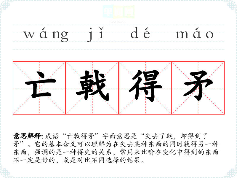 成语“亡戟得矛”字面意思是“失去了戟,却得到了矛”。它的基本含义可以理解为在失去某种东西的同时获得另一种东西,强调的是一种得失的关系,常用来比喻在变化中得到的东西不一定是好的,或是对比不同选择的结果。