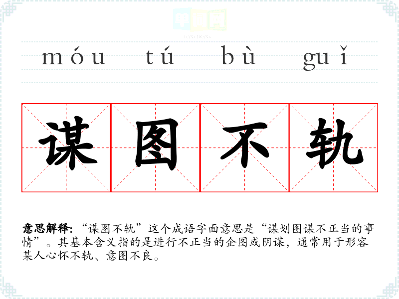 “谋图不轨”这个成语字面意思是“谋划图谋不正当的事情”。其基本含义指的是进行不正当的企图或阴谋,通常用于形容某人心怀不轨、意图不良。