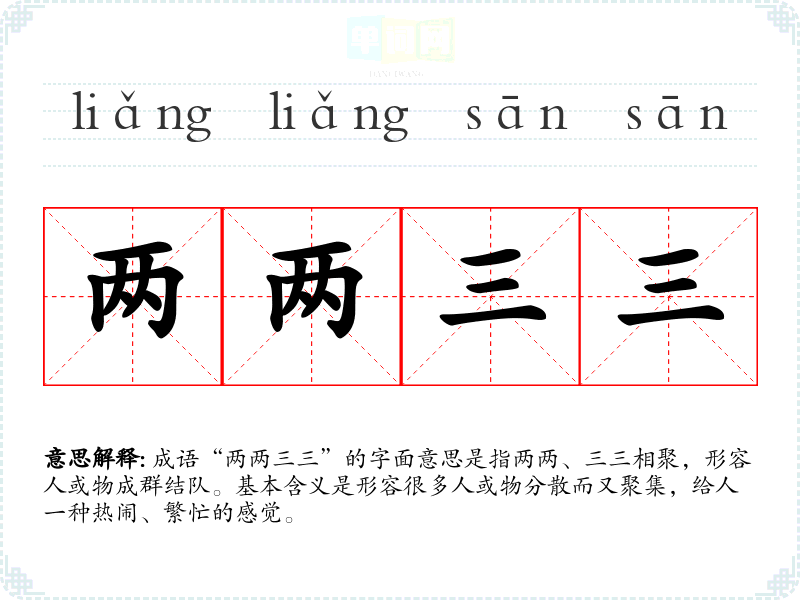 成语“两两三三”的字面意思是指两两、三三相聚,形容人或物成群结队。基本含义是形容很多人或物分散而又聚集,给人一种热闹、繁忙的感觉。