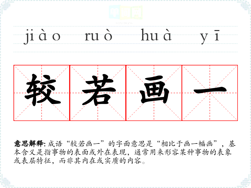成语“较若画一”的字面意思是“相比于画一幅画”,基本含义是指事物的表面或外在表现,通常用来形容某种事物的表象或表层特征,而非其内在或实质的内容。