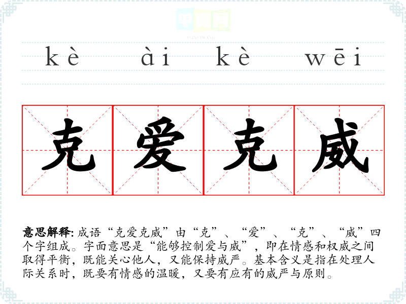 成语“克爱克威”由“克”、“爱”、“克”、“威”四个字组成。字面意思是“能够控制爱与威”,即在情感和权威之间取得平衡,既能关心他人,又能保持威严。基本含义是指在处理人际关系时,既要有情感的温暖,又要有应有的威严与原则。