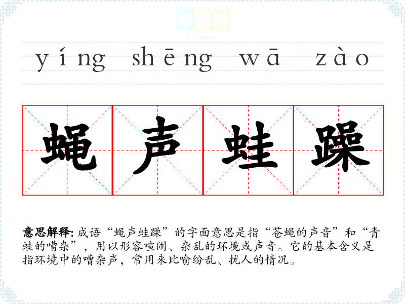 成语“蝇声蛙躁”的字面意思是指“苍蝇的声音”和“青蛙的嘈杂”,用以形容喧闹、杂乱的环境或声音。它的基本含义是指环境中的嘈杂声,常用来比喻纷乱、扰人的情况。