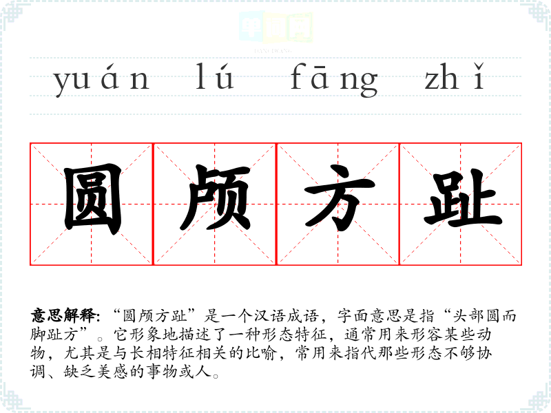 “圆颅方趾”是一个汉语成语,字面意思是指“头部圆而脚趾方”。它形象地描述了一种形态特征,通常用来形容某些动物,尤其是与长相特征相关的比喻,常用来指代那些形态不够协调、缺乏美感的事物或人。