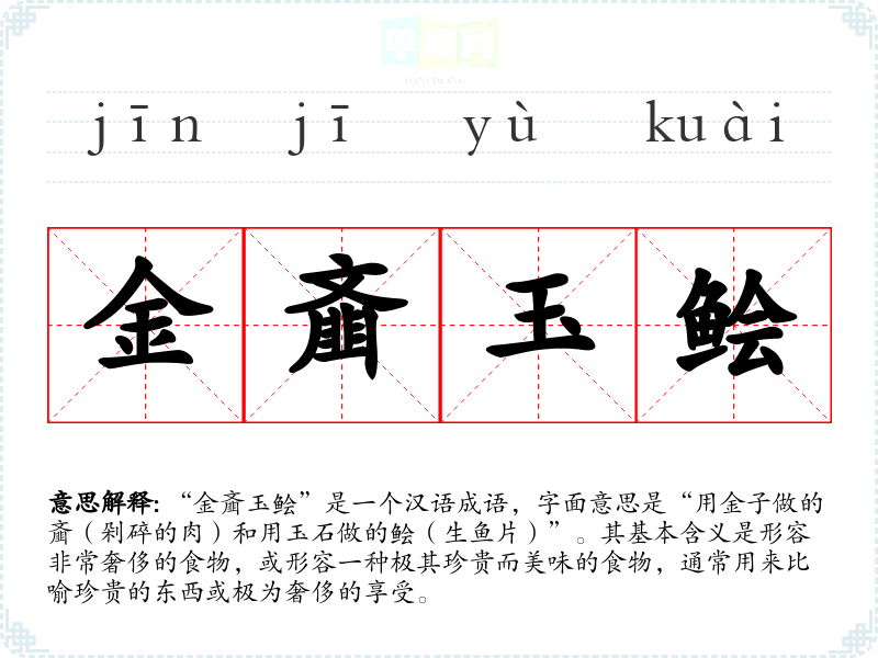 “金齑玉鲙”是一个汉语成语,字面意思是“用金子做的齑(剁碎的肉)和用玉石做的鲙(生鱼片)”。其基本含义是形容非常奢侈的食物,或形容一种极其珍贵而美味的食物,通常用来比喻珍贵的东西或极为奢侈的享受。