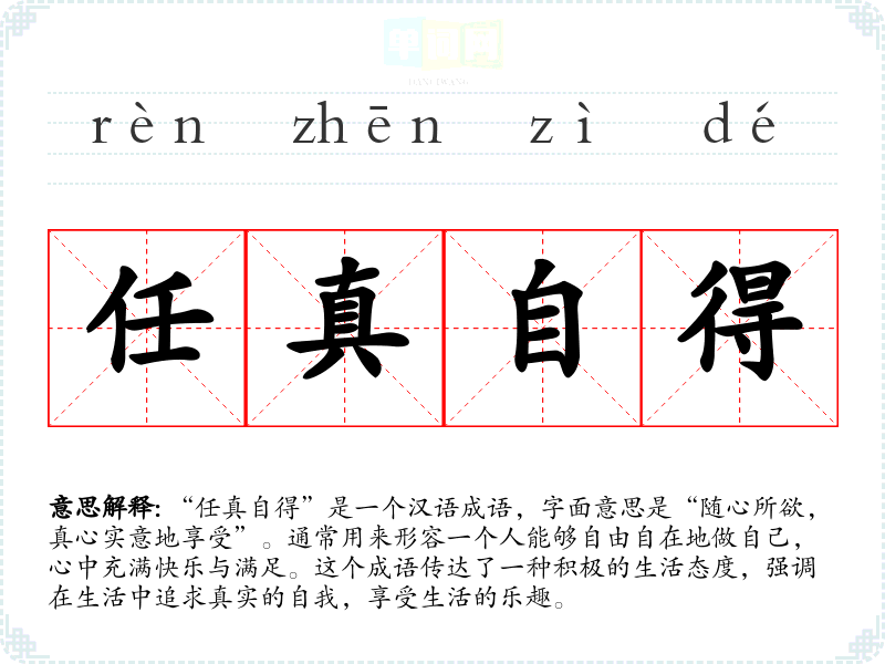 “任真自得”是一个汉语成语,字面意思是“随心所欲,真心实意地享受”。通常用来形容一个人能够自由自在地做自己,心中充满快乐与满足。这个成语传达了一种积极的生活态度,强调在生活中追求真实的自我,享受生活的乐趣。