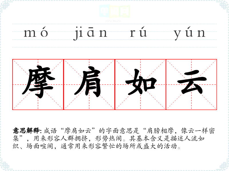 成语“摩肩如云”的字面意思是“肩膀相摩,像云一样密集”,用来形容人群拥挤,形势热闹。其基本含义是描述人流如织、场面喧闹,通常用来形容繁忙的场所或盛大的活动。