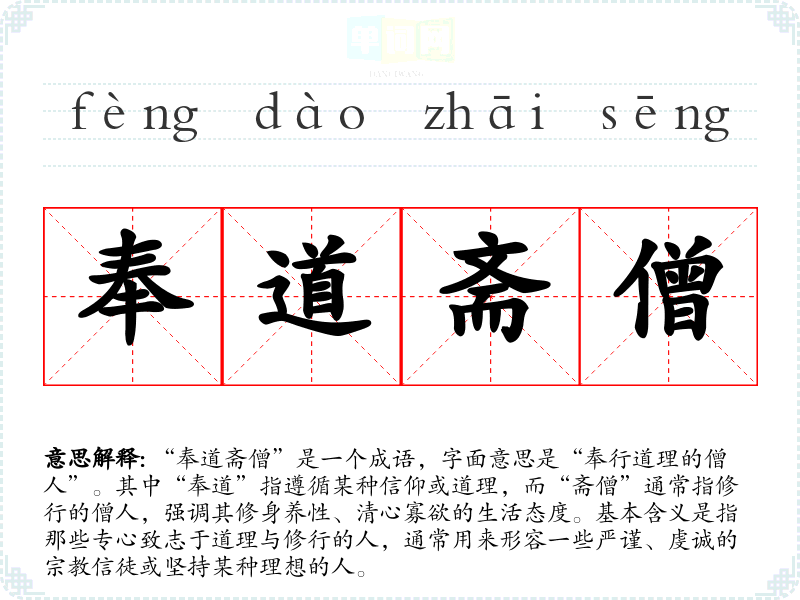 | 奉道斋僧 | 奉道:信奉道教,泛指佛道;斋僧:施舍僧人饭食。信仰道教行善事。 |