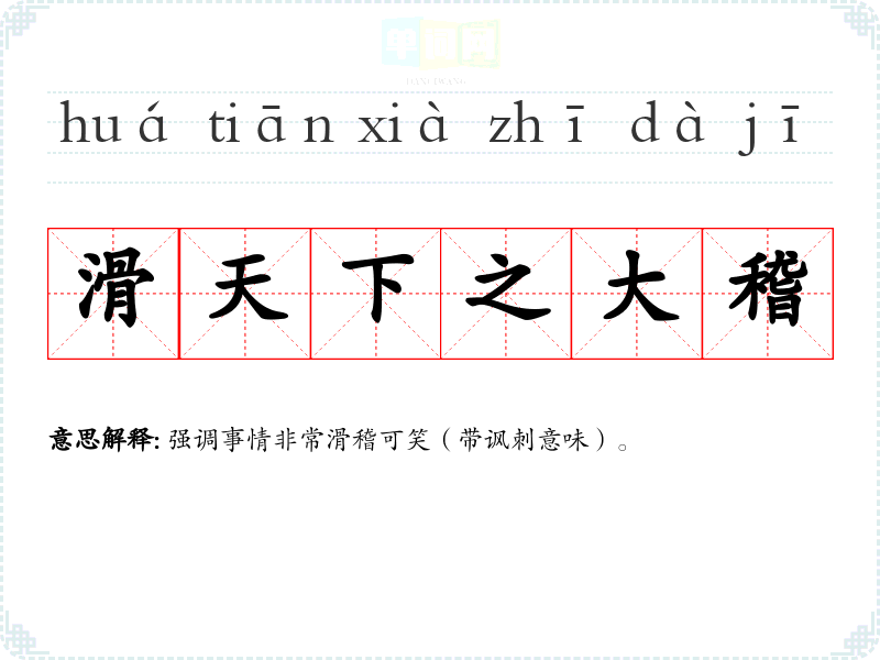 | 滑天下之大稽 | 强调事情非常滑稽可笑(带讽刺意味)。 |