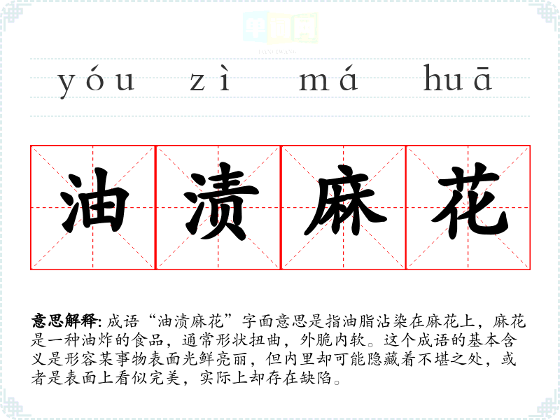 成语“油渍麻花”字面意思是指油脂沾染在麻花上,麻花是一种油炸的食品,通常形状扭曲,外脆内软。这个成语的基本含义是形容某事物表面光鲜亮丽,但内里却可能隐藏着不堪之处,或者是表面上看似完美,实际上却存在缺陷。